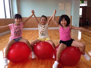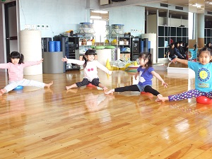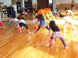 ダンスの他にもボールやフープ、パラシュート等の道具を使って身体を動かすことで、身体能力向上を目指します。